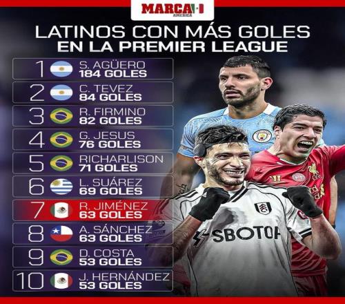 英超拉美球员射手榜:阿圭罗184球第1,希门尼斯63球升至第7